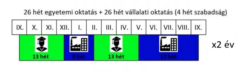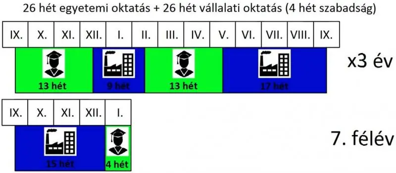 A képzési rendszer attól duális, hogy a gyakorlati oktatás a Debreceni Egyetem Műszaki Karán kívül – a képzési időnek közel a felében – a duális képzésben résztvevő Partnervállalatainknál történik. A képzés alapképzésben 7 féléven keresztül (3,5 év), mesterképzésben 4 féléven keresztül (2 év) tart. Az alábbi ábrán tekinthető meg a képzési idő elosztása:
